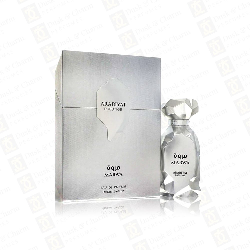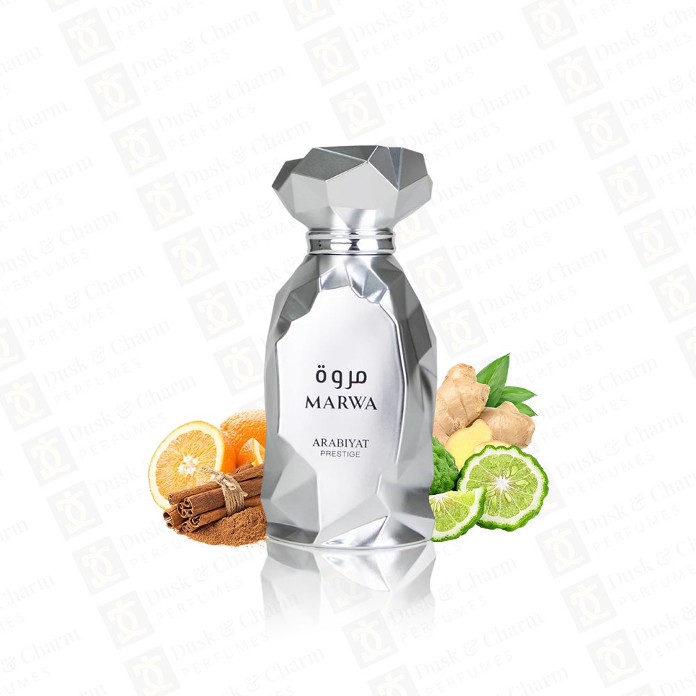 Arabiyat Prestige Marwa is a refined and modern fragrance that opens with a vibrant blend of Calabrian bergamot, lemon, and Sicilian orange, delivering a fresh citrus burst. The heart reveals a warm and aromatic fusion of Nigerian ginger, Ceylon cinnamon, and Tunisian neroli, adding spicy elegance. It finishes with a deep, sophisticated base of Chinese black tea, ambroxan, olibanum, and guaiac wood, creating a long-lasting and luxurious scent perfect for all occasions.