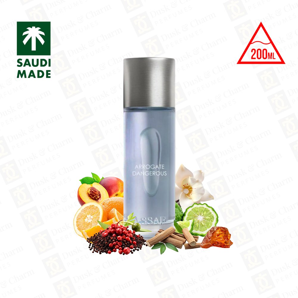 Arrogate Dangerous by Assaf is a bold and captivating fragrance that opens with a vibrant blend of orange, peach, bergamot, and pink pepper, creating a fresh yet slightly spicy introduction. The heart reveals a smooth fusion of lemon blossom and sandalwood, adding depth and elegance. It settles into a warm, long-lasting base of musk, vanilla, amber, and cedarwood, leaving a seductive trail that’s perfect for both day and night wear.