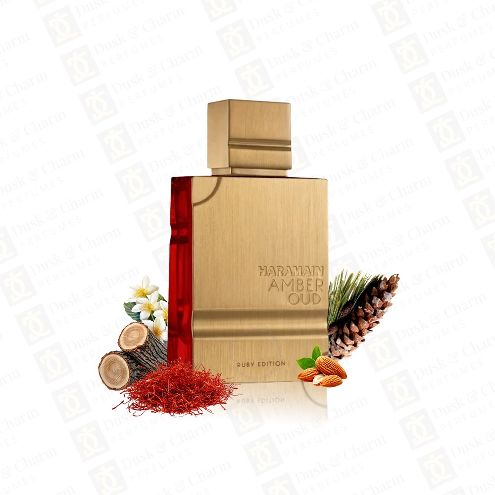 Haramain Amber Oud Ruby Edition is a bold and luxurious fragrance crafted for those who love deep, sensual scents. It opens with a rich blend of saffron and bitter almond, creating a warm and slightly spicy introduction. The heart reveals elegant Egyptian jasmine balanced with smooth cedarwood, adding depth and sophistication. The fragrance settles into a powerful base of ambergris, woody notes, musk, and fir resin, leaving a long-lasting, intense trail. Perfect for evening wear and special occasions.