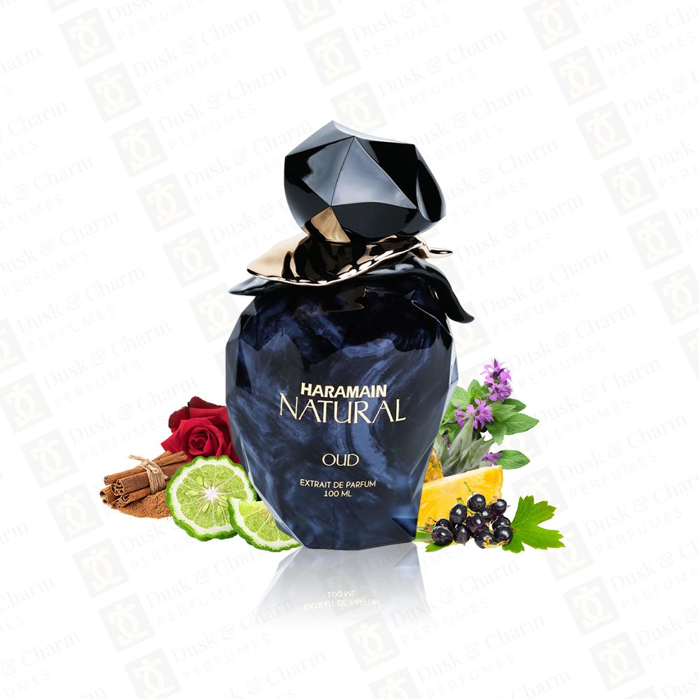 Haramain Natural Oud opens with a vibrant burst of bergamot, pineapple, grapefruit, and black currant, enhanced by spicy pink pepper, nutmeg, and cloves. The heart reveals an aromatic fusion of rose, cardamom, cinnamon, ginger, and citron, adding warmth and elegance. It finishes with a rich, long-lasting base of natural oud, patchouli, vetiver, oakmoss, sandalwood, musk, tonka bean, and ambroxan, delivering a bold, refined, and luxurious oud experience.