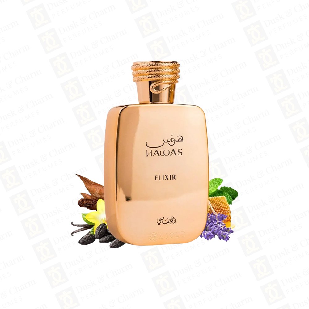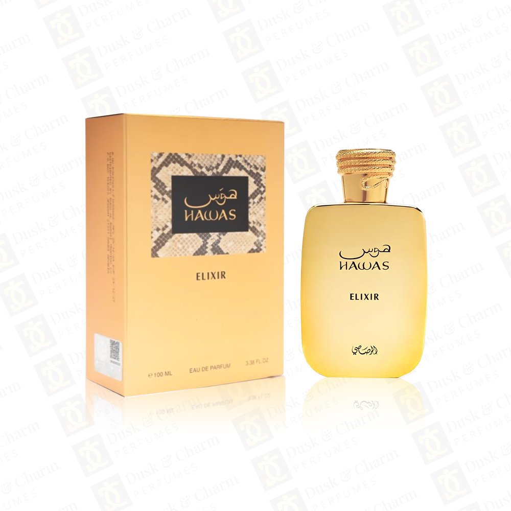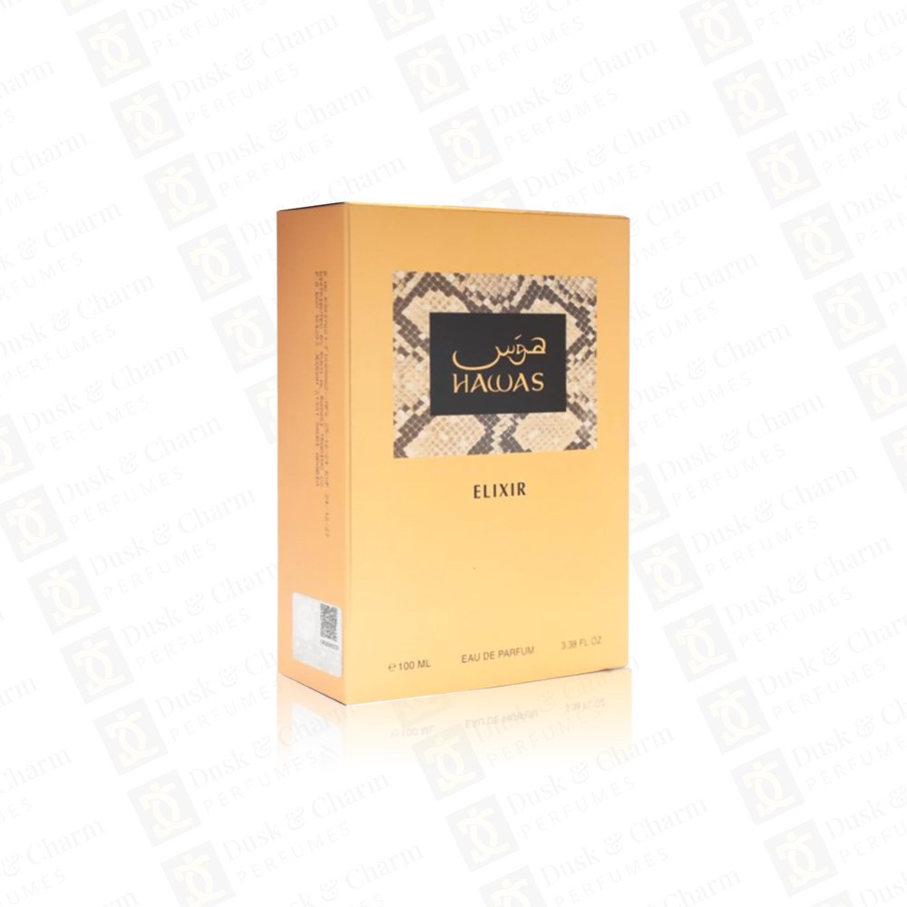 Hawas Elixir by Rasasi is a captivating gourmand-oriental fragrance with fresh mint, artemisia, and bergamot at the top. A heart of lavender, dark chocolate, and benzoin adds richness, while vanilla, tonka bean, and white musk create a warm, sensual base. Bold yet elegant, it’s perfect for evening wear and special moments.