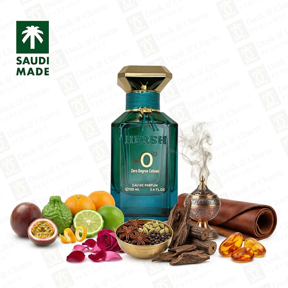Hersh Zero Degree Celsius is a bold oriental fragrance opening with fresh passionfruit and citrus, blooming into rose and spices, and settling into a deep, smoky base of oud, leather, and amber. Intense. Elegant. Unforgettable.