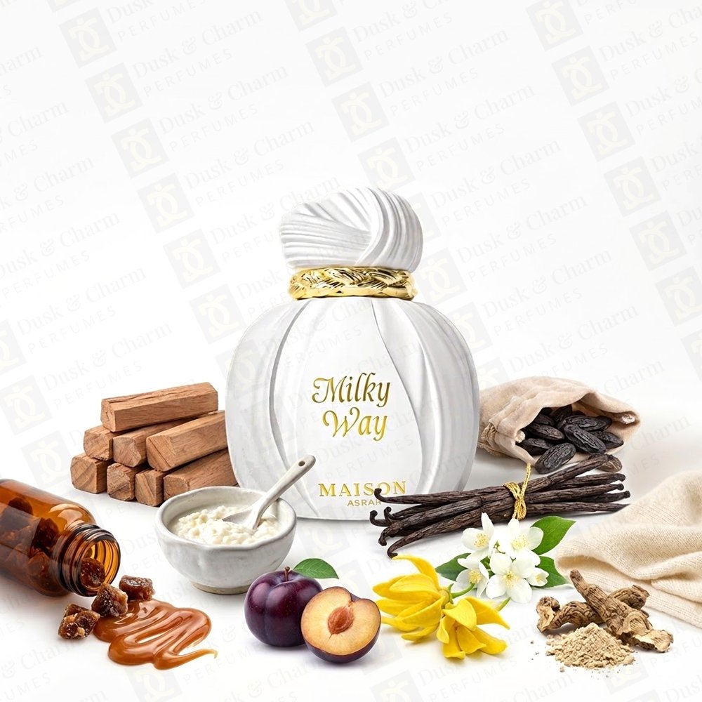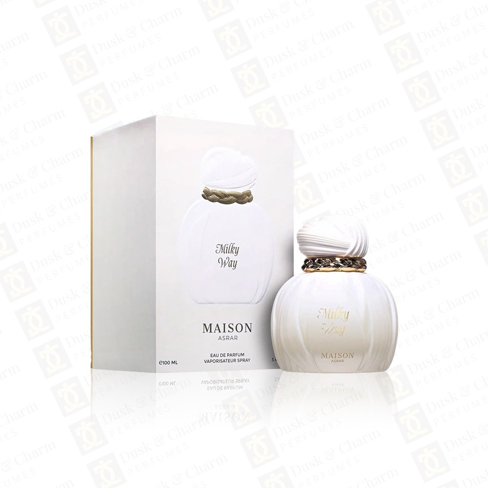 Milky Way Maison Asrar is a deliciously creamy and comforting fragrance that blends sweet gourmand notes with soft florals and warm woods. It opens with a tempting mix of caramel, sweet milk, and plum, creating a rich and indulgent first impression.