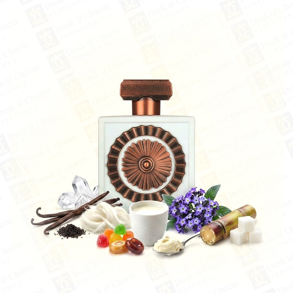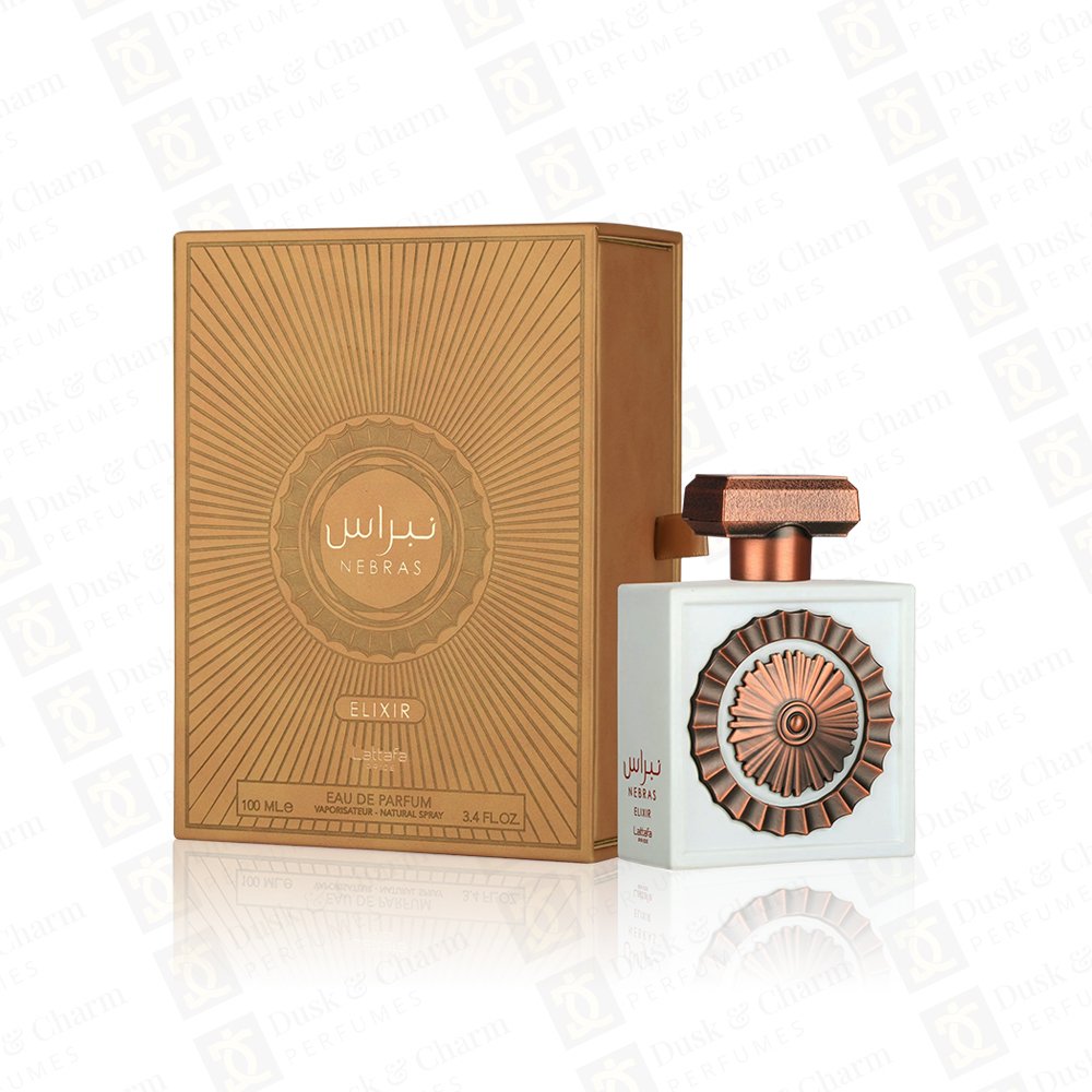 Nibras Elixir by Lattafa is a creamy gourmand fragrance with sweet candy notes, soft florals, and a warm vanilla-musky base.