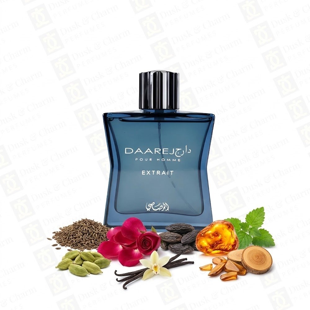 Rasasi Daarej Pour Homme Extrait is a rich and captivating fragrance that blends warm spices with elegant floral and woody notes. It opens with a bold mix of cumin, cardamom, and artemisia, creating a distinctive spicy aroma that feels both powerful and refined.
