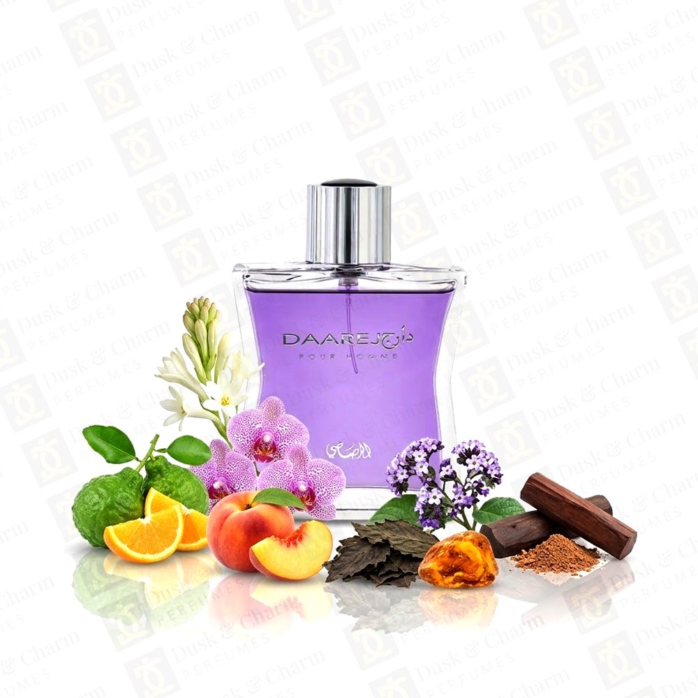 Rasasi Daarej Pour Homme is a sophisticated fragrance that blends fresh citrus with soft florals and warm woody notes. It opens with a refreshing mix of bergamot, orange, and peach, delivering a smooth and inviting fruity-citrus start.