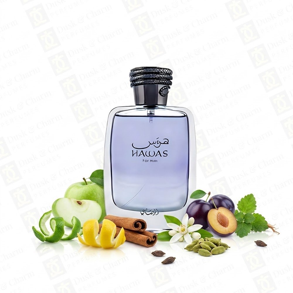Rasasi Hawas for Him is a vibrant and refreshing fragrance crafted for the modern man. It opens with a lively blend of apple, bergamot, lemon, and cinnamon, delivering a crisp and slightly spicy freshness. The heart unfolds with an elegant mix of orange blossom, cardamom, and plum, adding a smooth fruity-spicy character that feels both sophisticated and energetic.