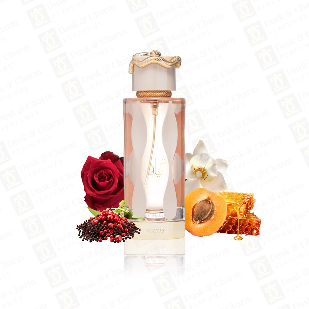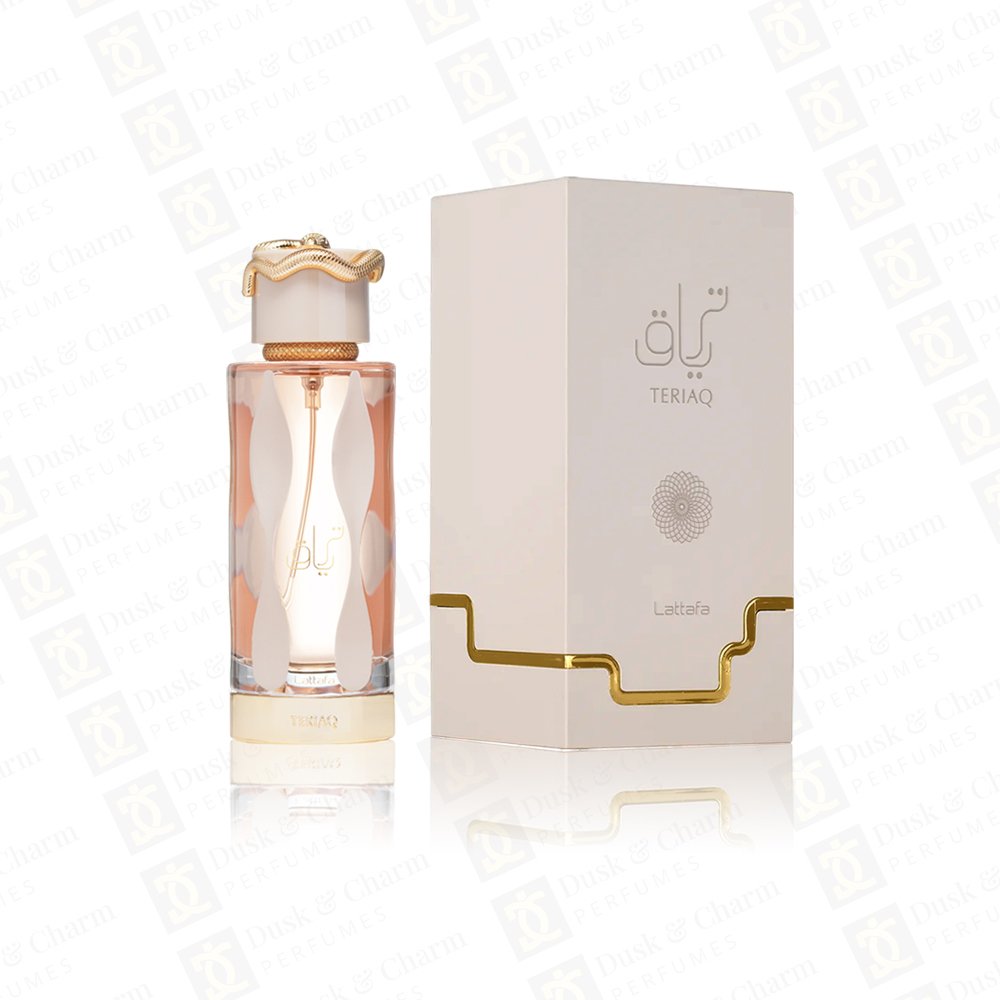 Teriaq by Lattafa is a rich, seductive unisex perfume that blends sweet gourmand warmth with floral elegance. It opens with a delicious mix of pink pepper, caramel, and bitter almond layered with juicy apricot. The heart reveals an irresistible bouquet of white flowers, rose, and honey touched with rhubarbβs subtle tartness. The base settles into a smooth trail of vanilla, musk, vetiver, labdanum, and leather β creating a long-lasting, sensual, and luxurious scent perfect for any occasion.